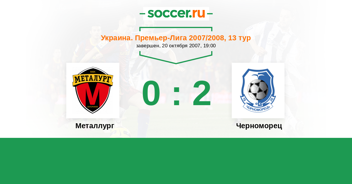 Украина. Премьер-Лига 19.10.2007 Металлург Логотип футбольный клуб Металлург (Запорожье) 0:2 Логотип футбольный клуб Черноморец (Одесса) Черноморец
