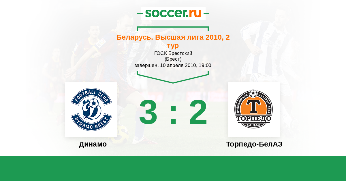 Беларусь. Высшая лига 09.06.2010 Торпедо-БелАЗ Логотип футбольный клуб Торпедо-БелАЗ (Жодино) 0:1 Логотип футбольный клуб Динамо (Брест) Динамо