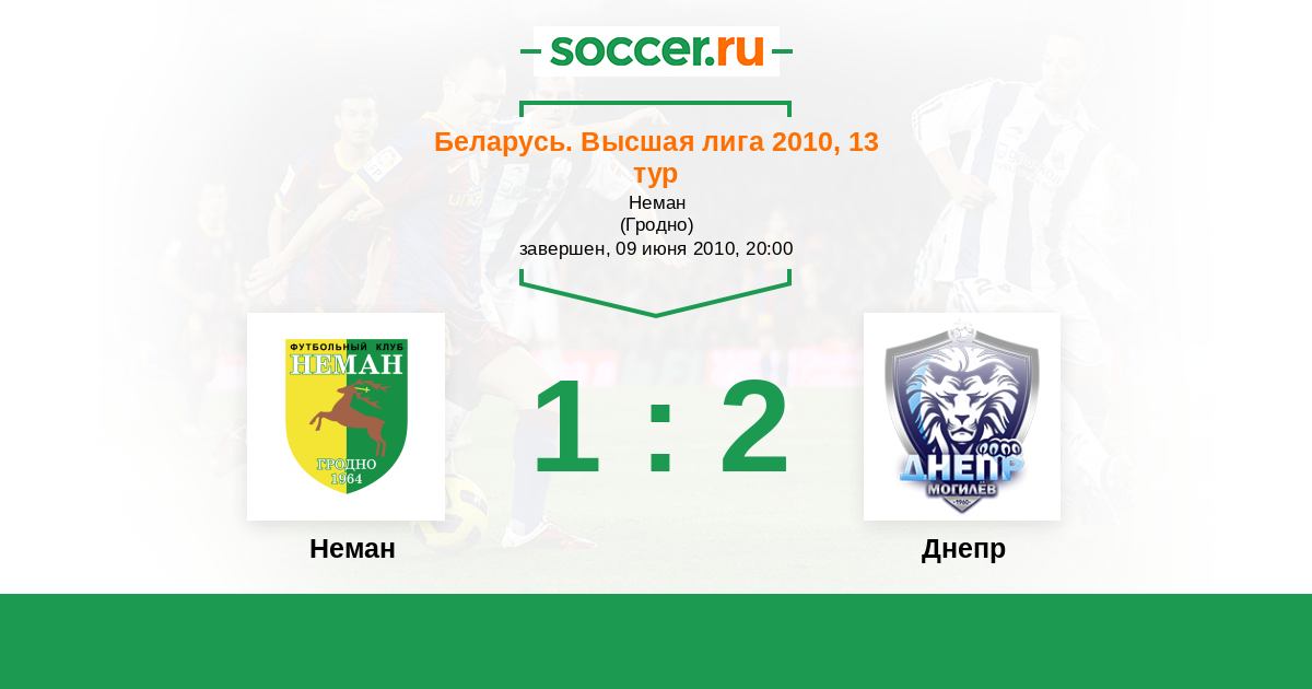 Беларусь. Высшая лига 10.04.2010 Днепр Логотип футбольный клуб Днепр (Могилев) 0:0 Логотип футбольный клуб Неман (Гродно) Неман
