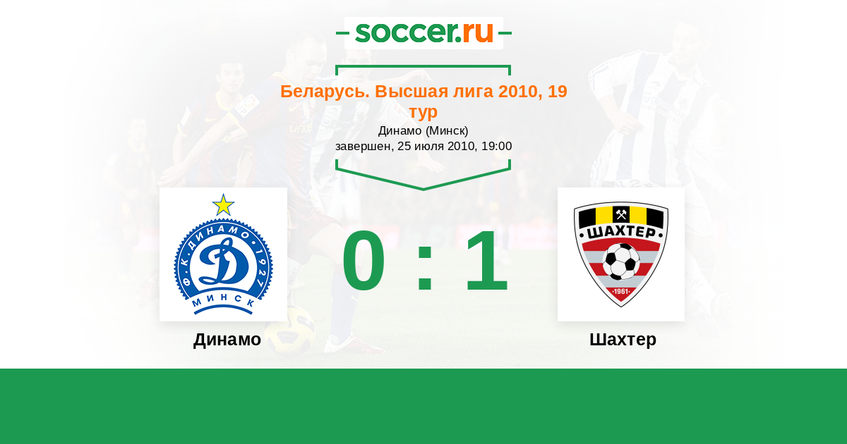 Беларусь. Высшая лига 19.09.2010 Шахтер Логотип футбольный клуб Шахтер (Солигорск) 3:0 Логотип футбольный клуб Динамо (Минск) Динамо