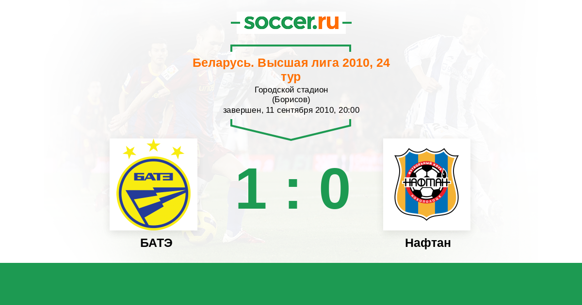 Беларусь. Высшая лига 24.04.2010 Нафтан Логотип футбольный клуб Нафтан (Новополоцк) 0:2 Логотип футбольный клуб БАТЭ (Борисов) БАТЭ