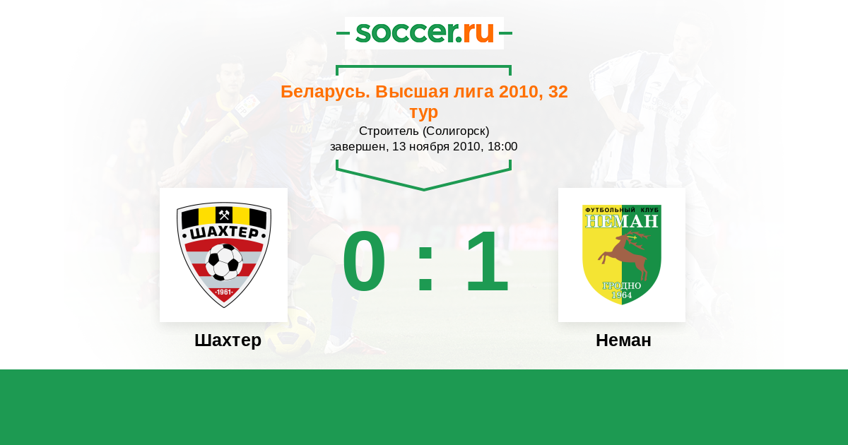 Беларусь. Высшая лига 01.08.2010 Шахтер Логотип футбольный клуб Шахтер (Солигорск) 4:1 Логотип футбольный клуб Неман (Гродно) Неман