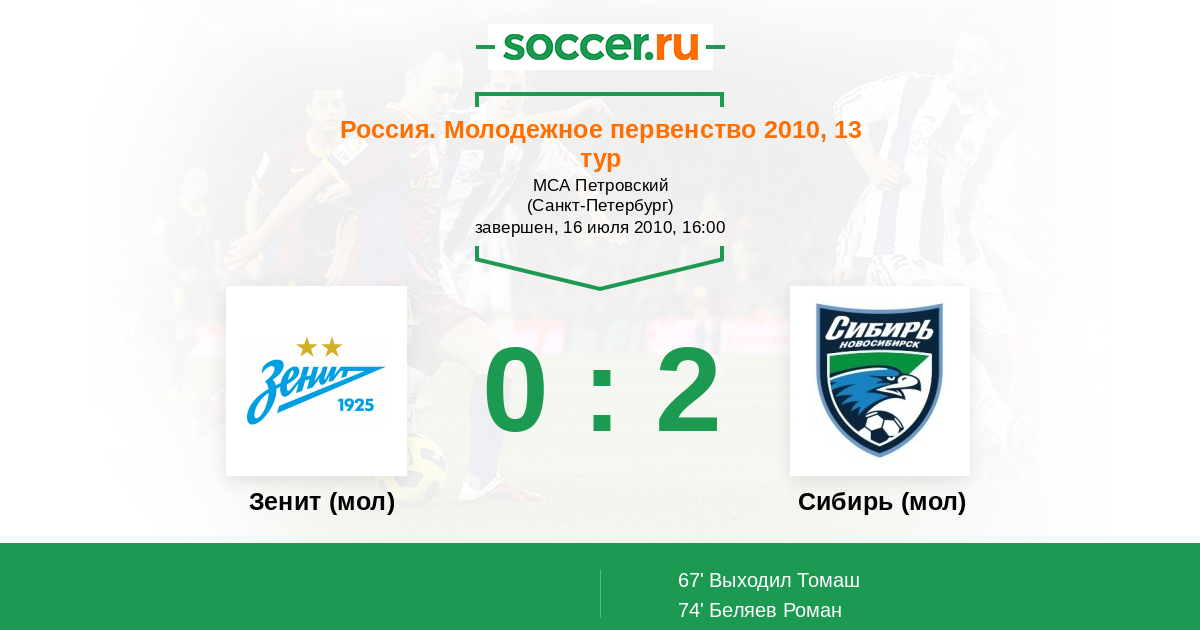 Протокол матча Зенит (мол) против Сибирь (мол)