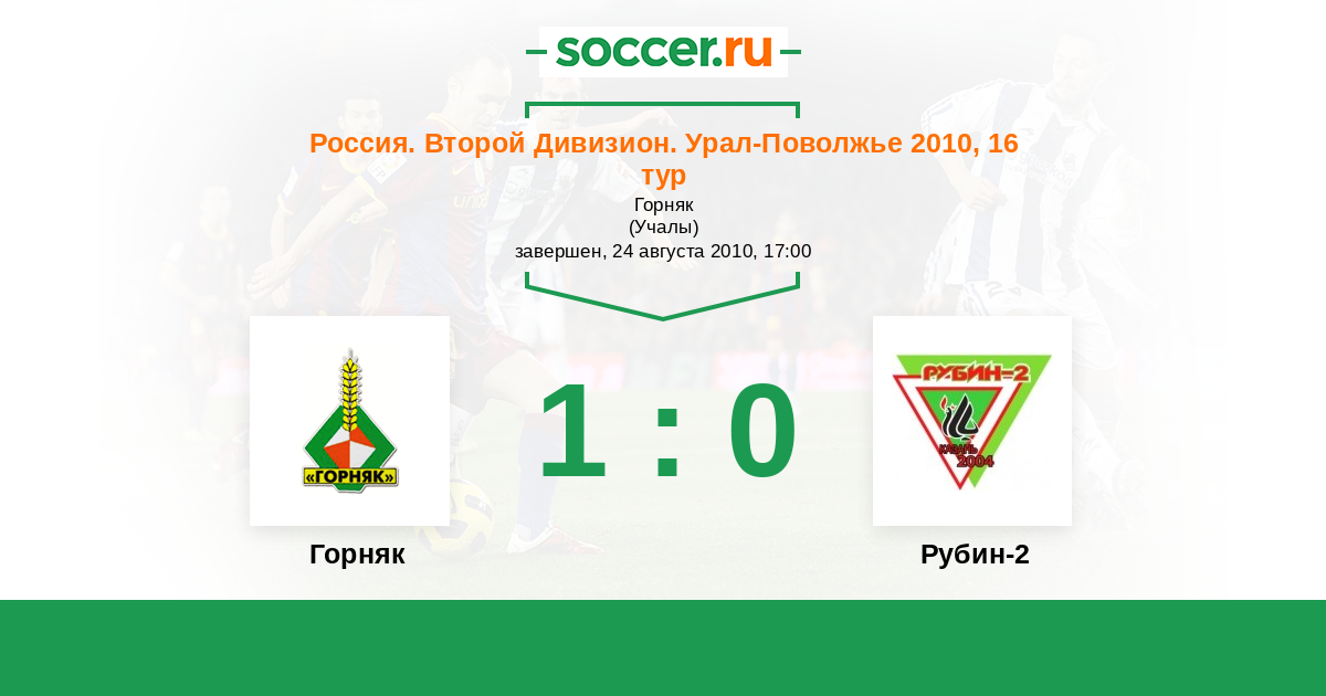Россия. Вторая лига. Группа 4 19.05.2010 Рубин-2 Логотип футбольный клуб Рубин-2 (Казань) 0:3 Логотип футбольный клуб Горняк (Учалы) Горняк
