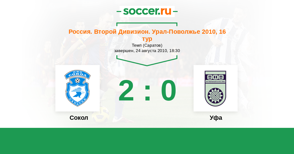 Россия. Вторая лига. Группа 4 19.05.2010 Уфа Логотип футбольный клуб Уфа 0:1 Логотип футбольный клуб Сокол (Саратов) Сокол