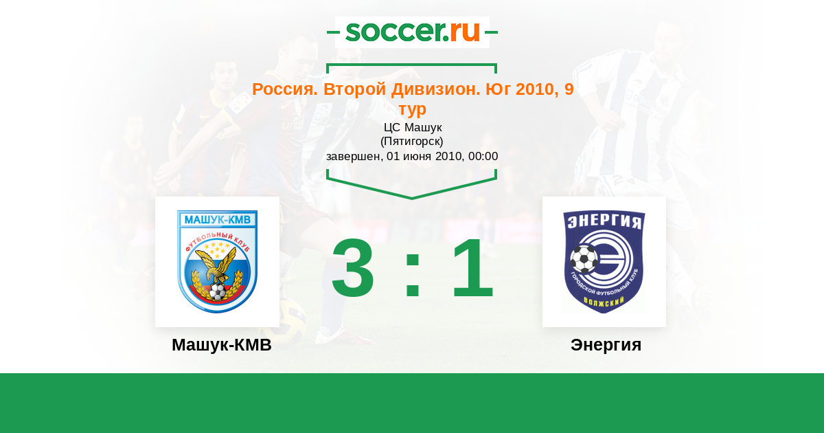 Россия. Вторая лига. Группа 1 03.10.2009 Машук-КМВ Логотип футбольный клуб Машук-КМВ (Пятигорск) 3:1 Логотип футбольный клуб Энергия (Волжский) Энергия