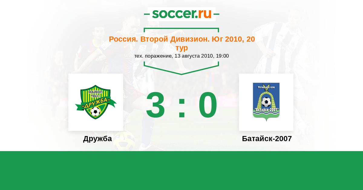 Россия. Вторая лига. Группа 1 30.04.2010 Батайск-2007 Логотип футбольный клуб Батайск-2007 0:0 Логотип футбольный клуб Дружба (Майкоп) Дружба