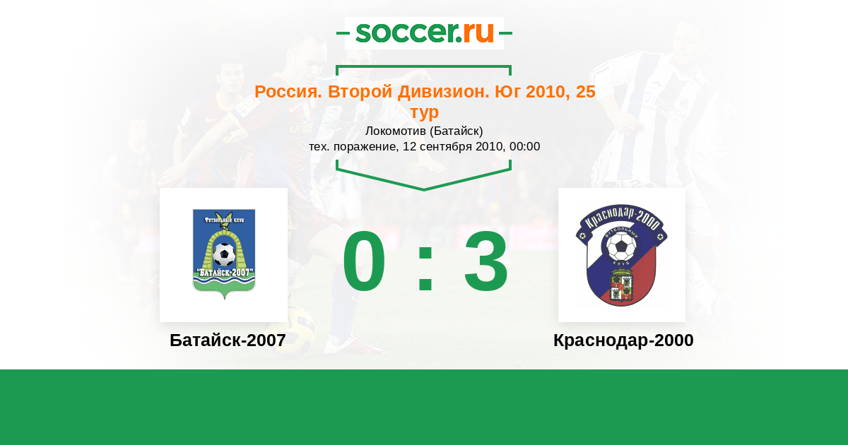 Россия. Вторая лига. Группа 1 12.09.2010 Батайск-2007 Логотип футбольный клуб Батайск-2007 0:3 Логотип футбольный клуб Краснодар-2000 Краснодар-2000