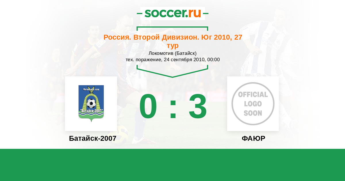 Россия. Вторая лига. Группа 1 24.09.2010 Батайск-2007 Логотип футбольный клуб Батайск-2007 0:3 Логотип футбольный клуб ФАЮР (Беслан) ФАЮР