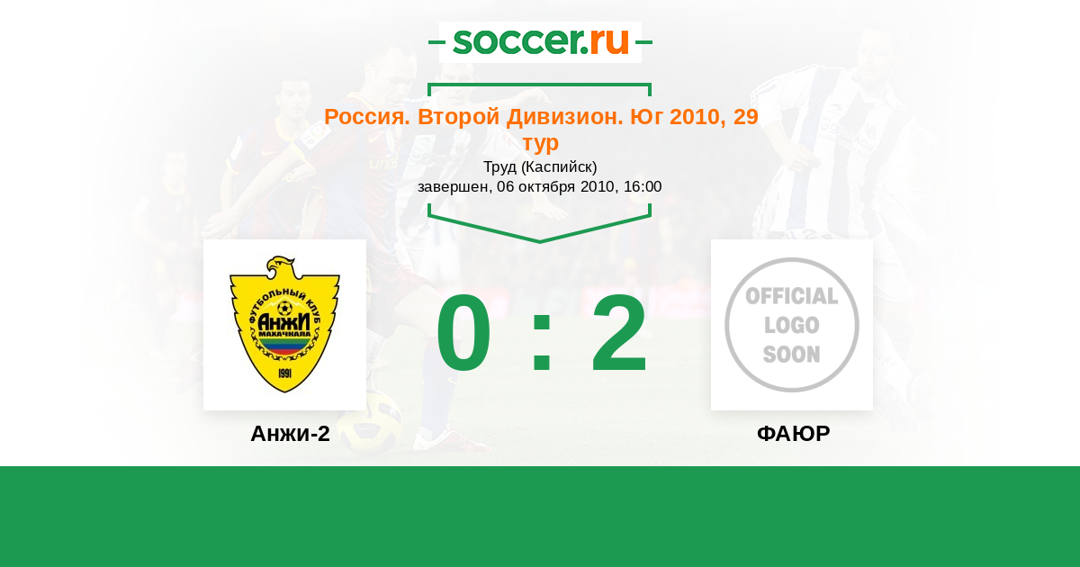 Россия. Вторая лига. Группа 1 28.06.2010 ФАЮР Логотип футбольный клуб ФАЮР (Беслан) 2:1 Логотип футбольный клуб Дагдизель (Махачкала) Дагдизель