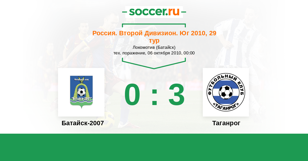 Россия. Вторая лига. Группа 1 06.10.2010 Батайск-2007 Логотип футбольный клуб Батайск-2007 0:3 Логотип футбольный клуб Таганрог Таганрог