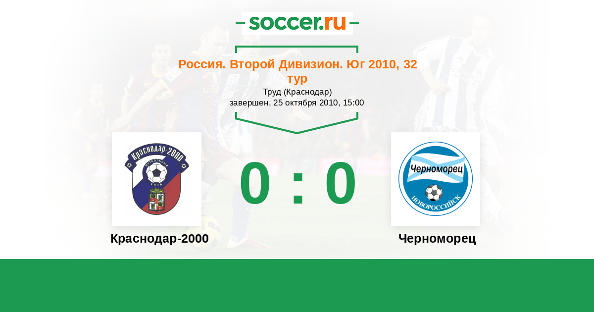 Россия. Вторая лига. Группа 1 25.10.2010 Краснодар-2000 Логотип футбольный клуб Краснодар-2000 0:0 Логотип футбольный клуб Черноморец (Новороссийск) Черноморец
