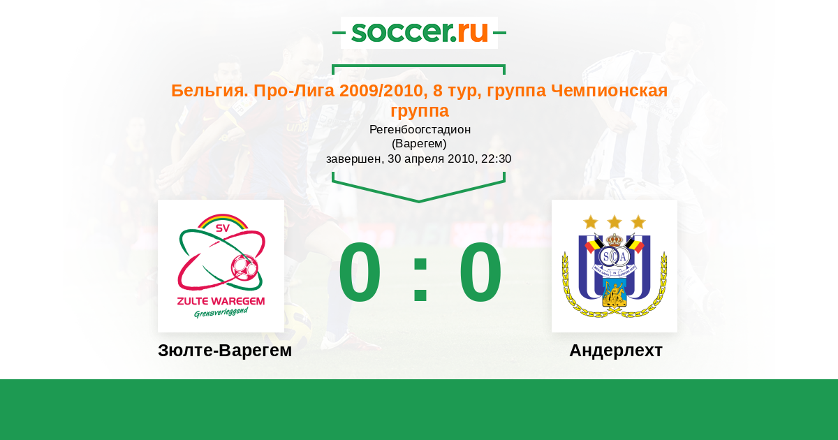 Бельгия. Про-Лига 28.03.2010 Андерлехт Логотип футбольный клуб Андерлехт (Брюссель) 6:0 Логотип футбольный клуб Зюлте-Варегем Зюлте-Варегем