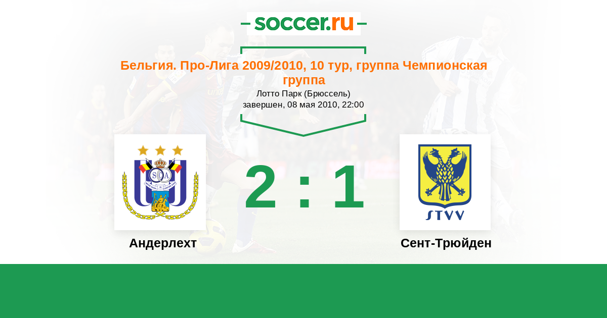 Бельгия. Про-Лига 09.04.2010 Сент-Трюйден Логотип футбольный клуб Сент-Трюйден (Синт-Трёйден) 1:1 Логотип футбольный клуб Андерлехт (Брюссель) Андерлехт