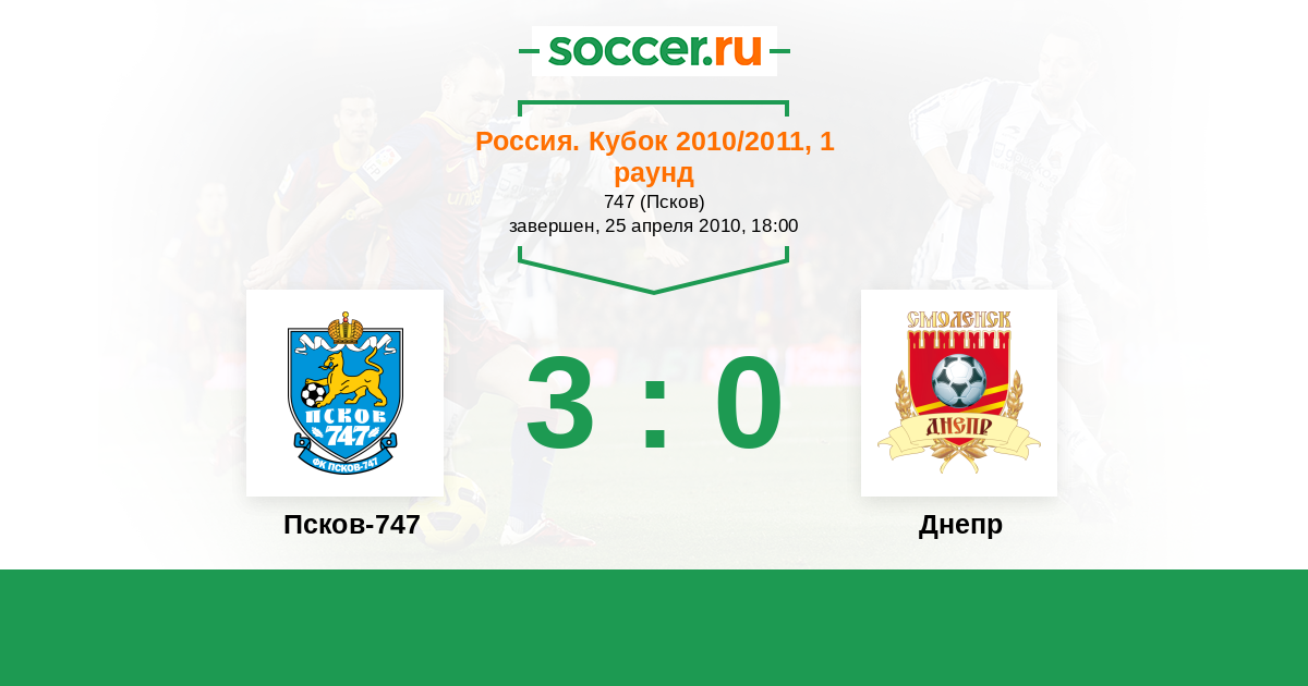 Россия. Вторая лига. Группа 2 17.07.2010 Днепр Логотип футбольный клуб Днепр (Смоленск) 1:1 Логотип футбольный клуб Псков-747 Псков-747