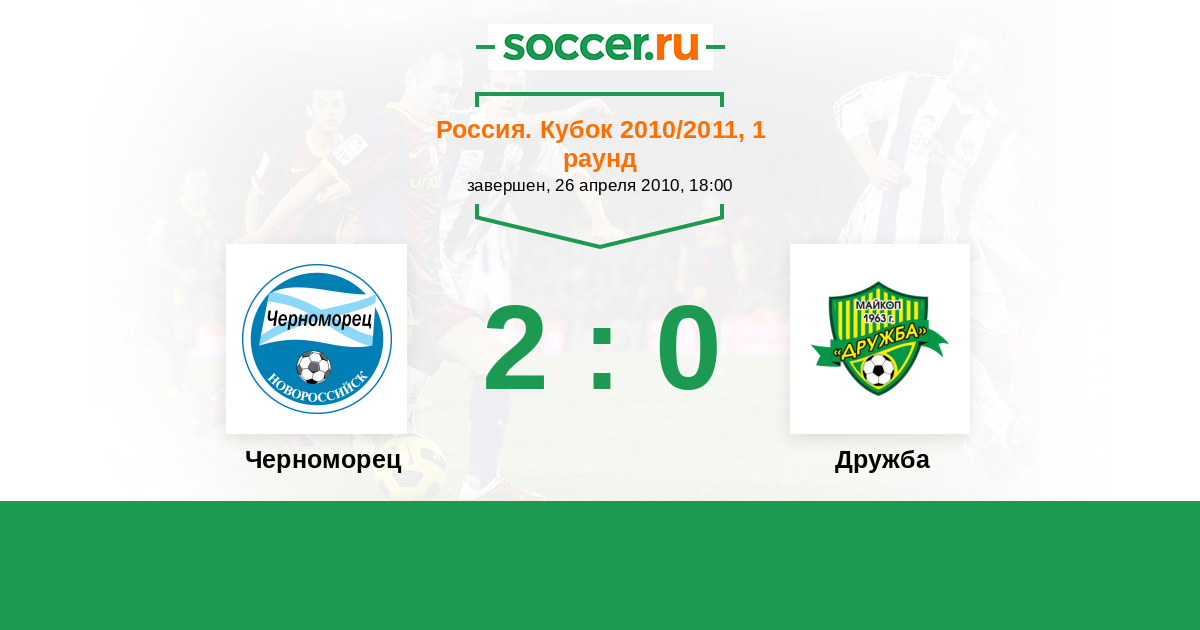 Россия. Вторая лига. Группа 1 24.09.2010 Дружба Логотип футбольный клуб Дружба (Майкоп) 0:2 Логотип футбольный клуб Черноморец (Новороссийск) Черноморец