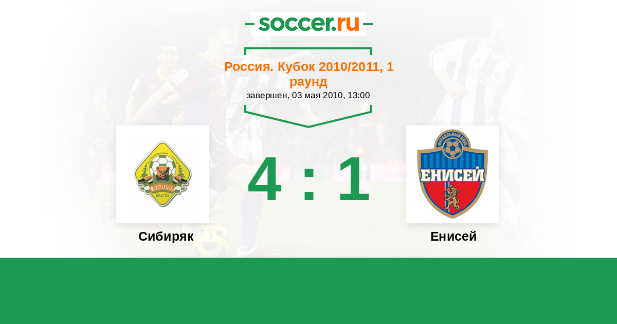 Россия. Кубок 02.05.2009 Енисей Логотип футбольный клуб Енисей (Красноярск) 4:2 Логотип футбольный клуб Сибиряк (Братск) Сибиряк