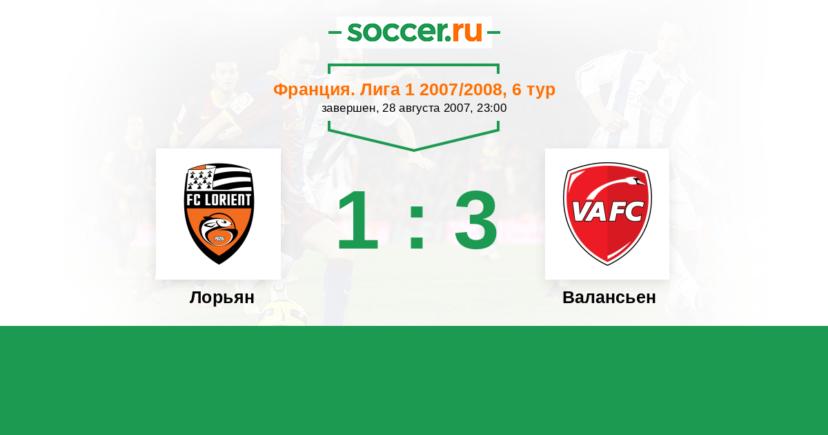 Франция. Лига 1 23.08.2008 Валансьен Логотип футбольный клуб Валансьен 3:1 Логотип футбольный клуб Лорьян Лорьян