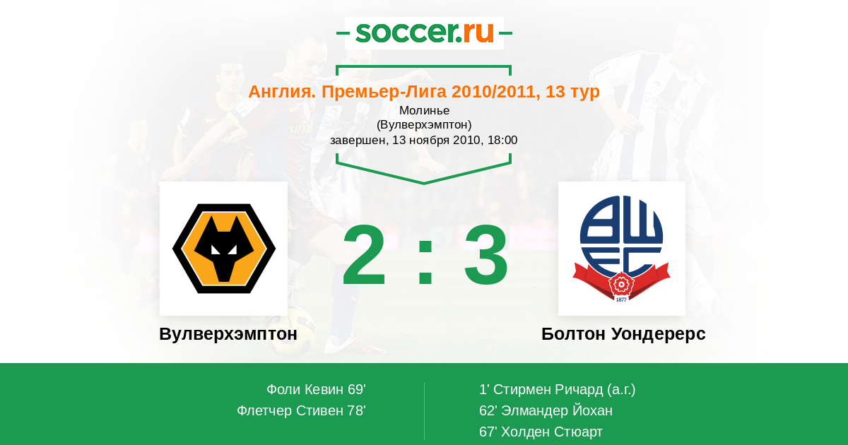 Протокол матча Вулверхэмптон против Болтон Уондерерс