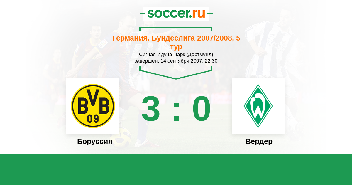 Германия. Бундеслига 01.03.2008 Вердер Логотип футбольный клуб Вердер (Бремен) 2:0 Логотип футбольный клуб Боруссия (Дортмунд) Боруссия