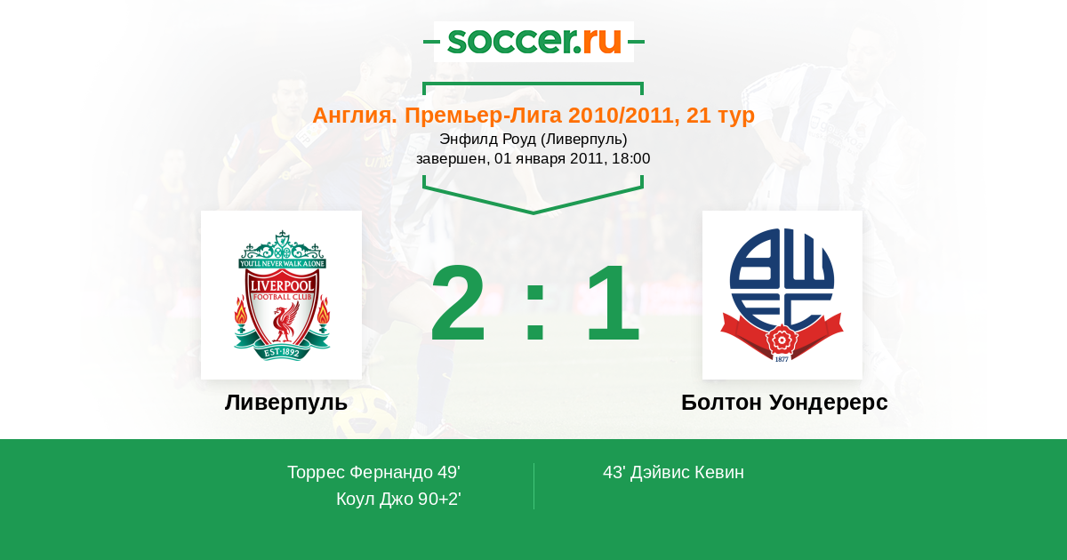 Протокол матча Ливерпуль против Болтон Уондерерс
