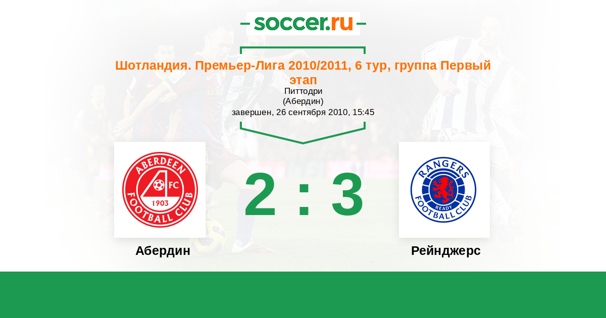 Шотландия. Премьер-Лига 13.11.2010 Рейнджерс Логотип футбольный клуб Рейнджерс (Глазго) 2:0 Логотип футбольный клуб Абердин Абердин