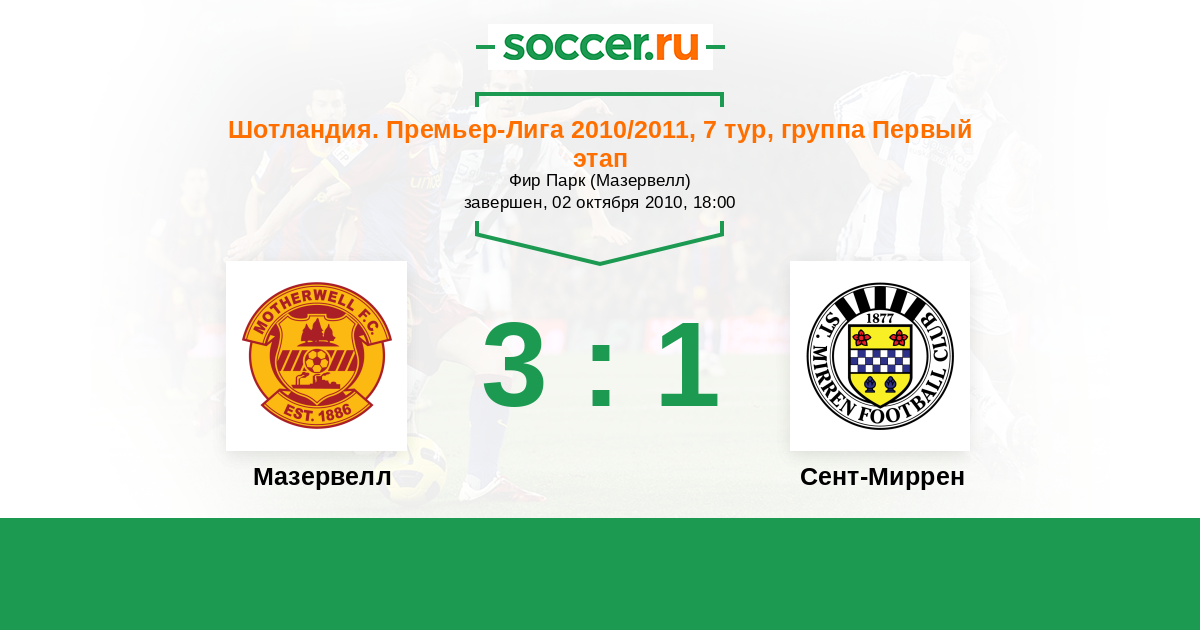 Шотландия. Премьер-Лига 20.11.2010 Сент-Миррен Логотип футбольный клуб Сент-Миррен (Пейсли) 1:1 Логотип футбольный клуб Мазервелл Мазервелл