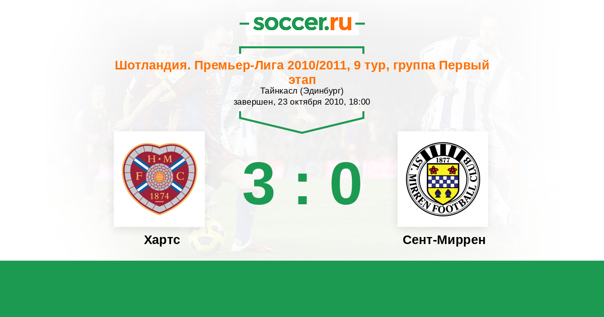 Шотландия. Премьер-Лига 17.09.2011 Хартс Логотип футбольный клуб Хартс (Эдинбург) 2:0 Логотип футбольный клуб Сент-Миррен (Пейсли) Сент-Миррен