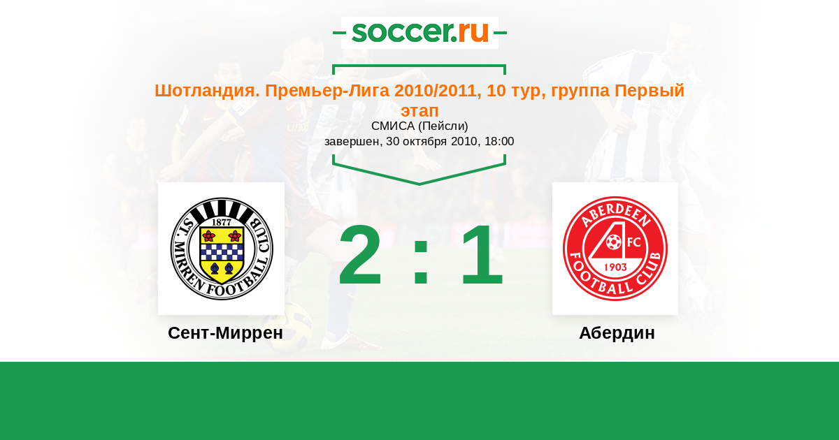 Шотландия. Премьер-Лига 06.04.2011 Сент-Миррен Логотип футбольный клуб Сент-Миррен (Пейсли) 3:2 Логотип футбольный клуб Абердин Абердин