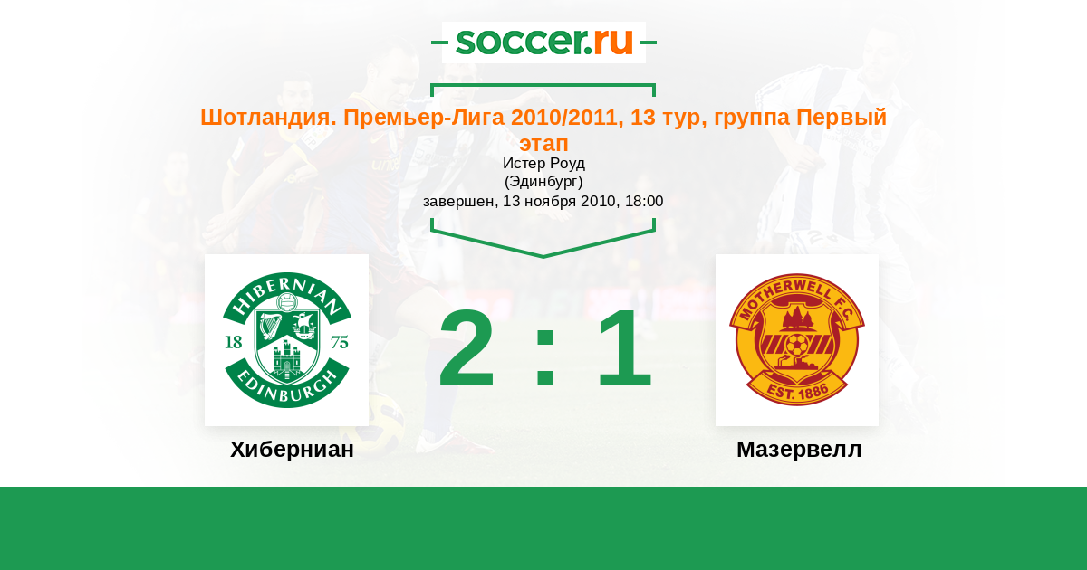 Шотландия. Премьер-Лига 15.08.2010 Мазервелл Логотип футбольный клуб Мазервелл 2:3 Логотип футбольный клуб Хиберниан (Эдинбург) Хиберниан