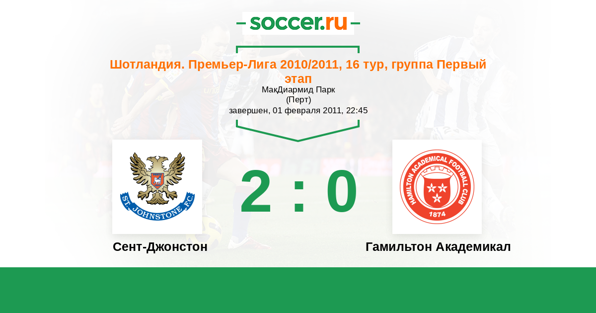 Шотландия. Премьер-Лига 23.10.2010 Гамильтон Академикал Логотип футбольный клуб Гамильтон Академикал 1:2 Логотип футбольный клуб Сент-Джонстон (Перт) Сент-Джонстон