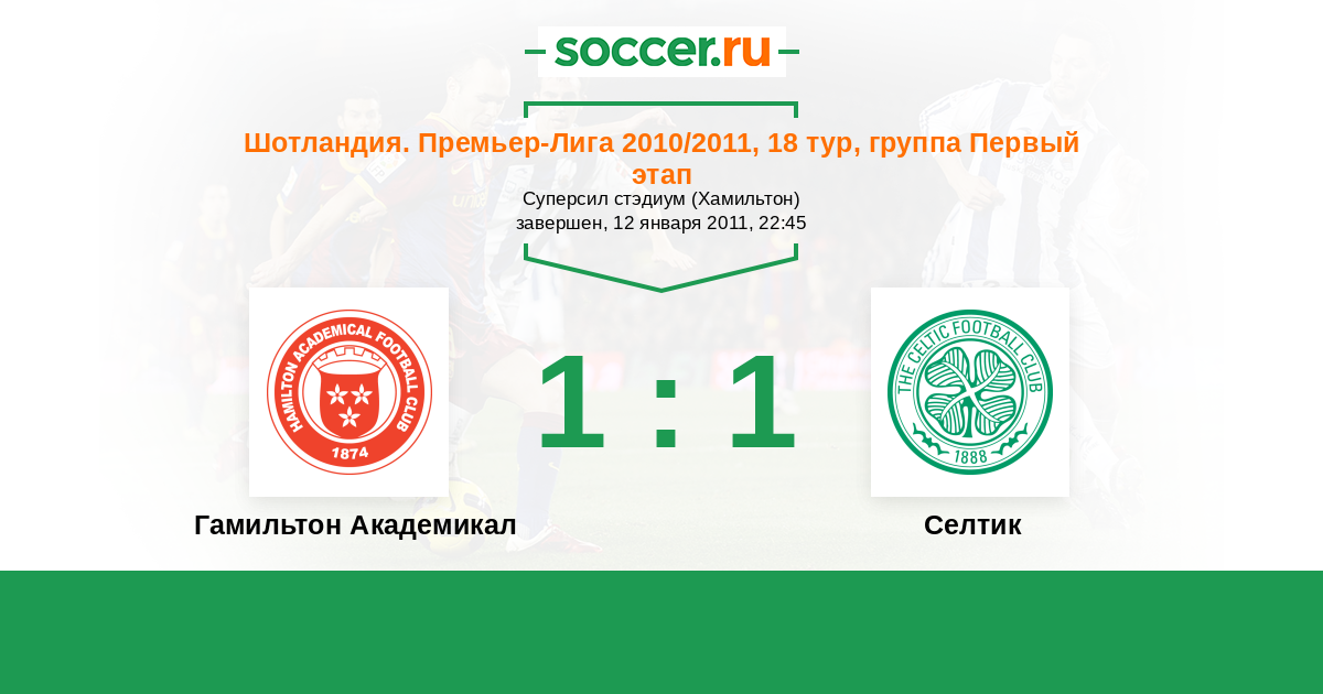 Шотландия. Премьер-Лига 05.03.2011 Селтик Логотип футбольный клуб Селтик (Глазго) 2:0 Логотип футбольный клуб Гамильтон Академикал Гамильтон Академикал