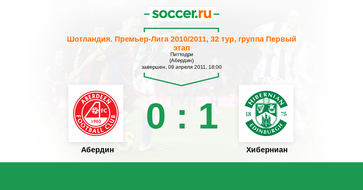 Шотландия. Премьер-Лига 26.12.2010 Хиберниан Логотип футбольный клуб Хиберниан (Эдинбург) 1:2 Логотип футбольный клуб Абердин Абердин