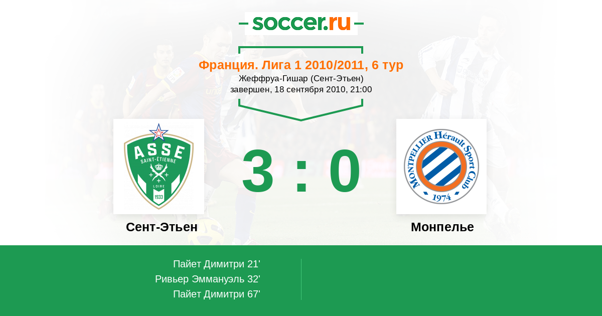 21' (1:0) Пайет Димитри (7) (Ривьер Эммануэль (29))