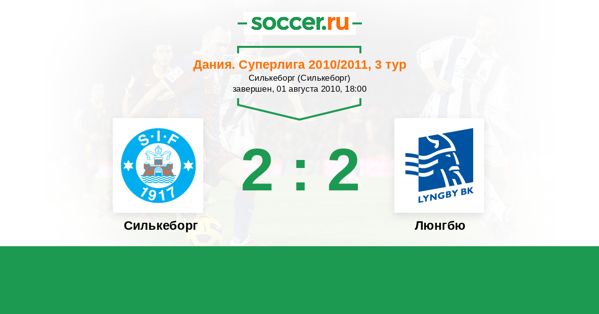 Дания. Суперлига 17.10.2010 Люнгбю Логотип футбольный клуб Люнгбю (Конгес Люнгбю) 1:1 Логотип футбольный клуб Силькеборг Силькеборг