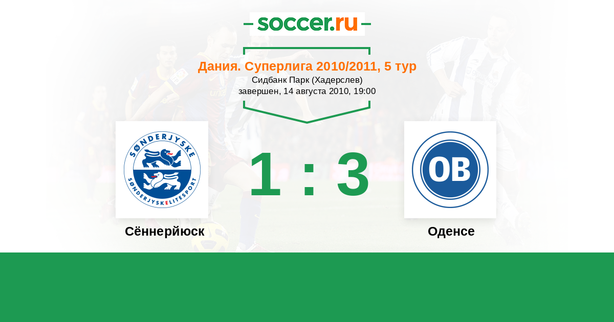 Дания. Суперлига 25.10.2010 Оденсе Логотип футбольный клуб Оденсе 1:2 Логотип футбольный клуб Сённерйюск (Хадерслев) Сённерйюск