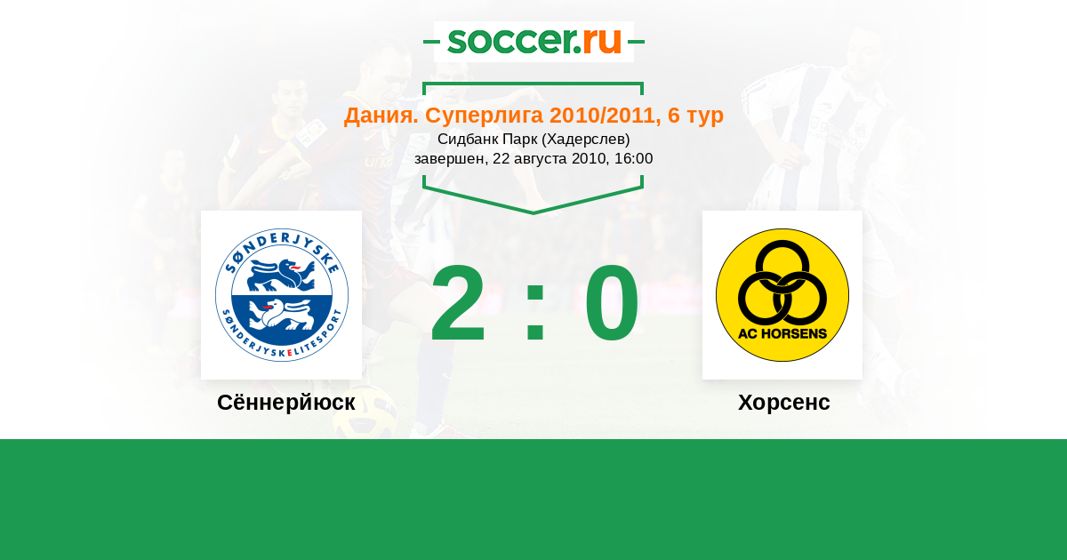Дания. Суперлига 21.11.2010 Сённерйюск Логотип футбольный клуб Сённерйюск (Хадерслев) 0:3 Логотип футбольный клуб Хорсенс Хорсенс