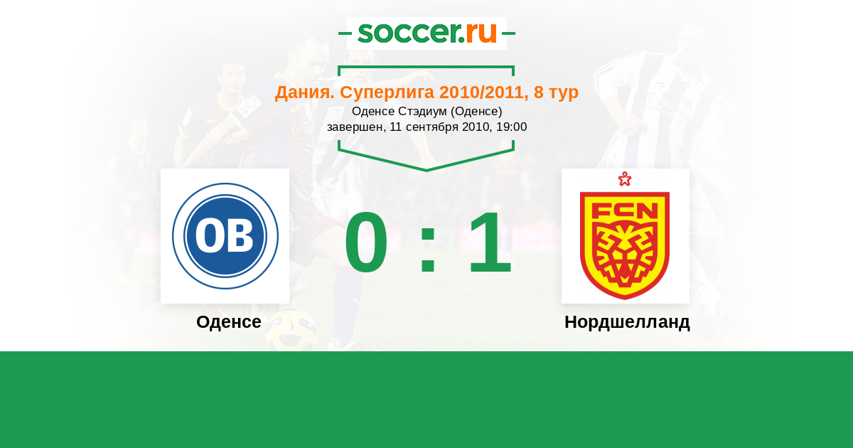 Дания. Суперлига 01.11.2010 Нордшелланд Логотип футбольный клуб Нордшелланд (Фарум) 1:4 Логотип футбольный клуб Оденсе Оденсе