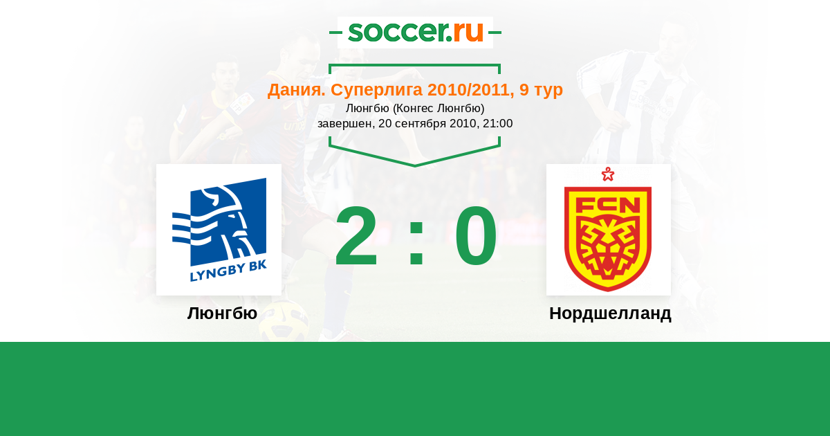 Дания. Суперлига 14.11.2010 Нордшелланд Логотип футбольный клуб Нордшелланд (Фарум) 2:1 Логотип футбольный клуб Люнгбю (Конгес Люнгбю) Люнгбю