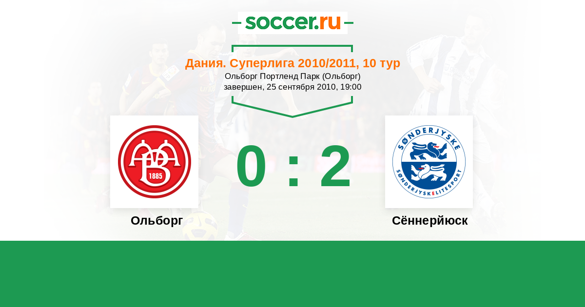Дания. Суперлига 16.10.2010 Сённерйюск Логотип футбольный клуб Сённерйюск (Хадерслев) 1:0 Логотип футбольный клуб Ольборг Ольборг