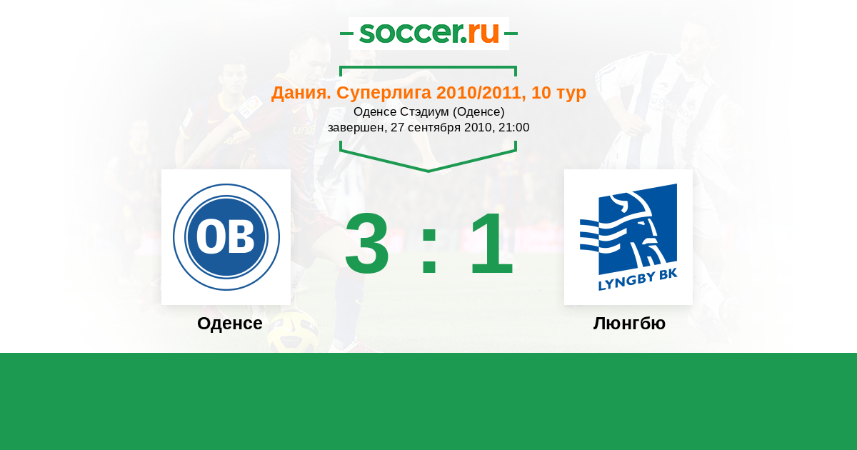 Дания. Суперлига 14.03.2011 Оденсе Логотип футбольный клуб Оденсе 2:0 Логотип футбольный клуб Люнгбю (Конгес Люнгбю) Люнгбю
