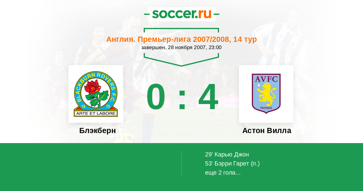 Протокол матча Блэкберн против Астон Вилла