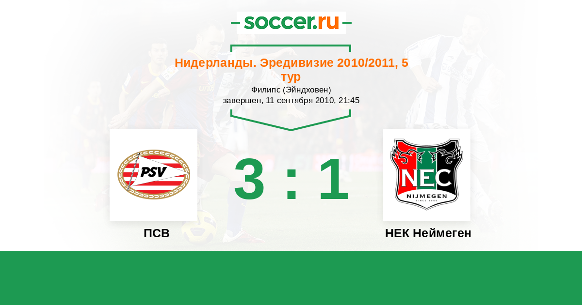 Нидерланды. Эредивизи 02.10.2011 НЕК Неймеген Логотип футбольный клуб НЕК Неймеген 0:2 Логотип футбольный клуб ПСВ (Эйндховен) ПСВ