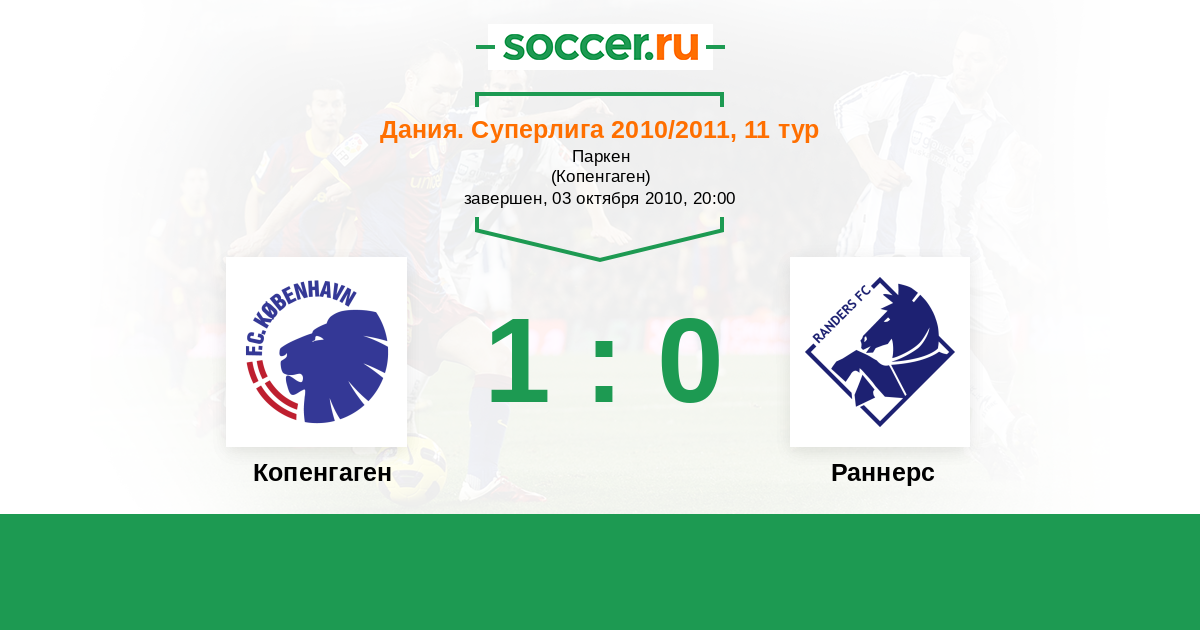 Дания. Суперлига 28.11.2010 Раннерс Логотип футбольный клуб Раннерс 0:3 Логотип футбольный клуб Копенгаген Копенгаген