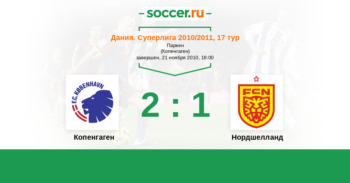 Дания. Суперлига 17.04.2011 Нордшелланд Логотип футбольный клуб Нордшелланд (Фарум) 1:3 Логотип футбольный клуб Копенгаген Копенгаген