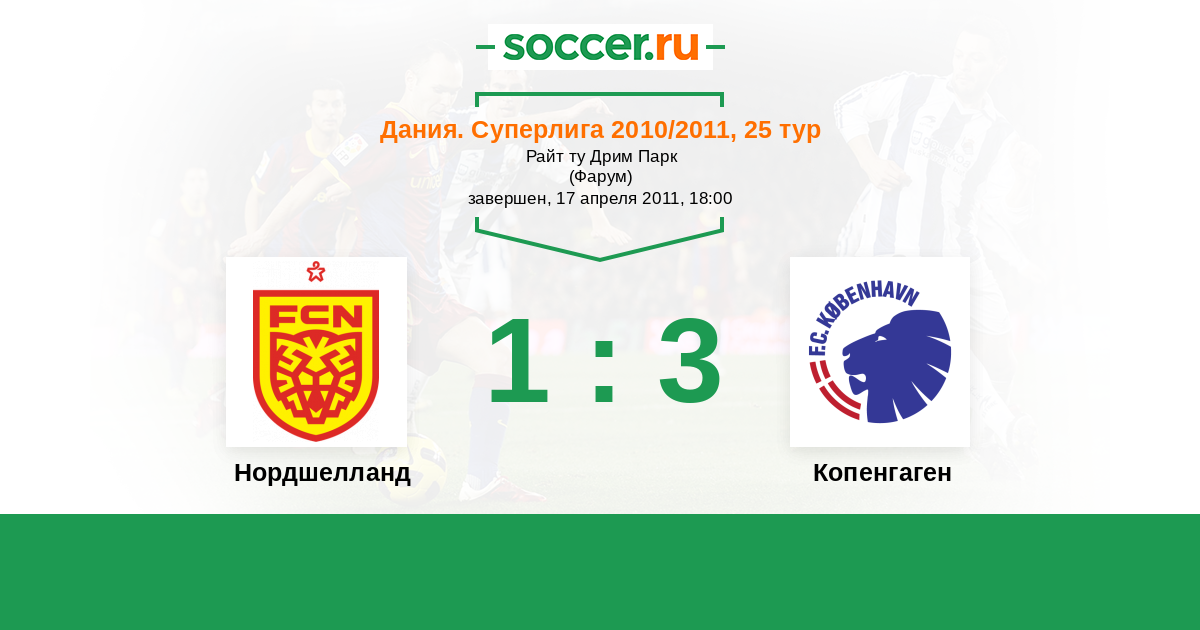 Дания. Суперлига 15.04.2013 Нордшелланд Логотип футбольный клуб Нордшелланд (Фарум) 2:3 Логотип футбольный клуб Копенгаген Копенгаген