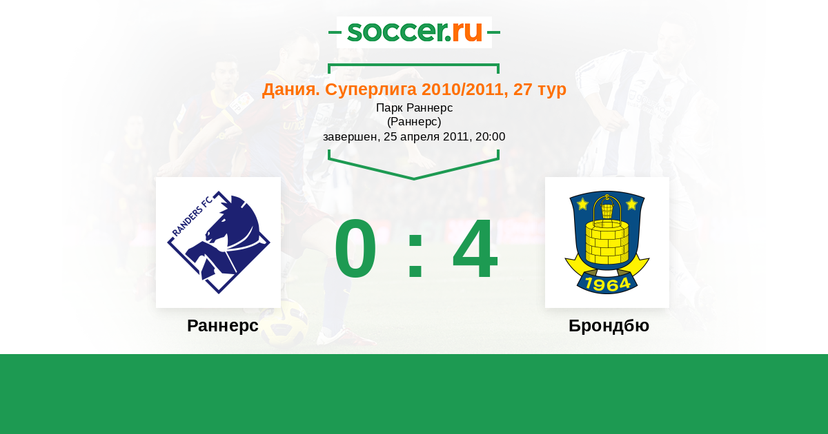 Дания. Суперлига 18.07.2010 Раннерс Логотип футбольный клуб Раннерс 3:2 Логотип футбольный клуб Брондбю (Брённбю) Брондбю