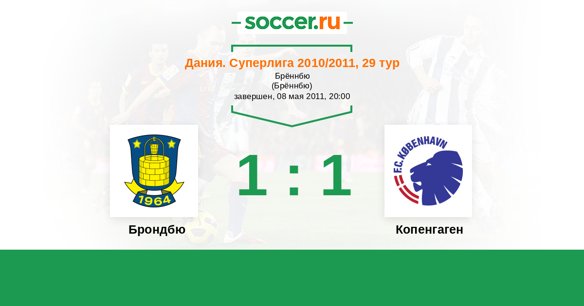 Дания. Суперлига 24.09.2011 Брондбю Логотип футбольный клуб Брондбю (Брённбю) 1:2 Логотип футбольный клуб Копенгаген Копенгаген