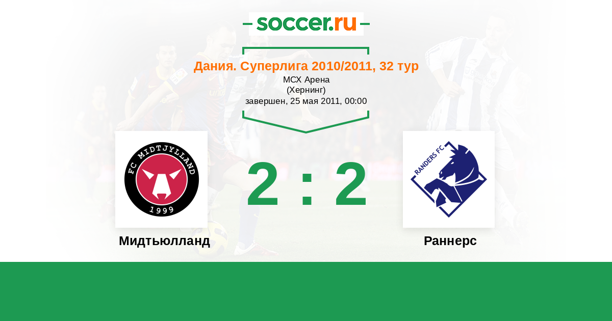 Дания. Суперлига 13.09.2010 Мидтьюлланд Логотип футбольный клуб Мидтьюлланд (Хернинг) 1:1 Логотип футбольный клуб Раннерс Раннерс