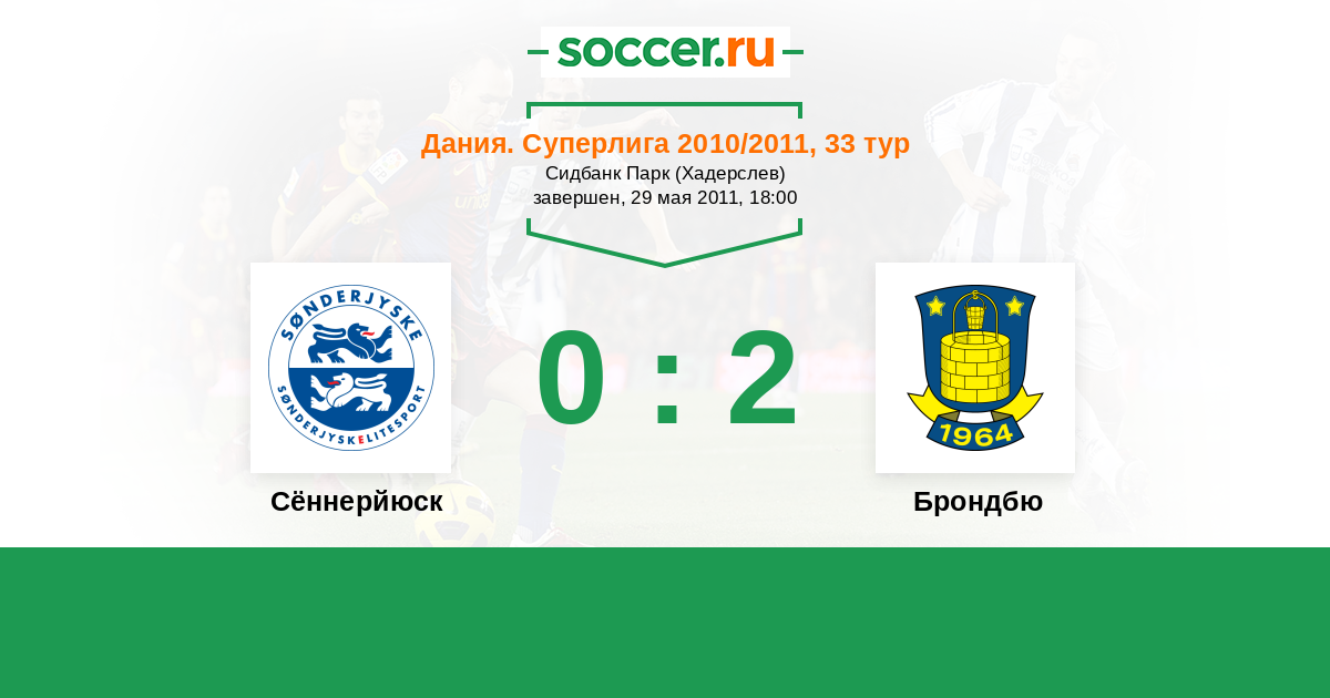 Дания. Суперлига 12.09.2010 Брондбю Логотип футбольный клуб Брондбю (Брённбю) 3:1 Логотип футбольный клуб Сённерйюск (Хадерслев) Сённерйюск